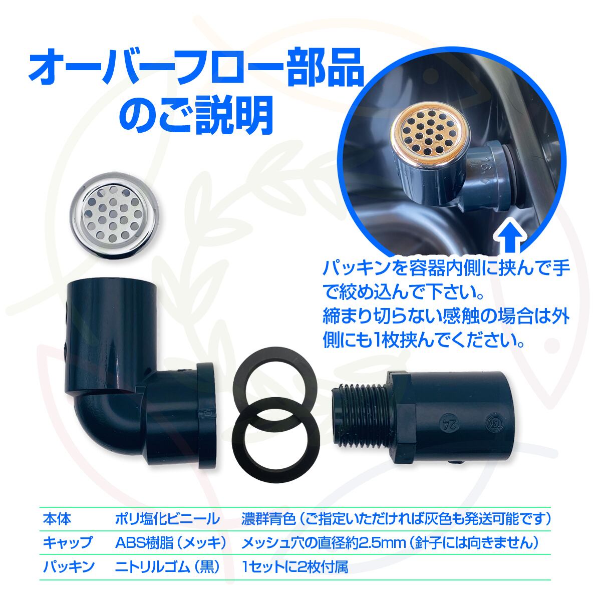 大雨や足し水の際、メダカや金魚の飼育ケースの水位を一定に保つ為のオーバーフロー加工用部品のセット。
